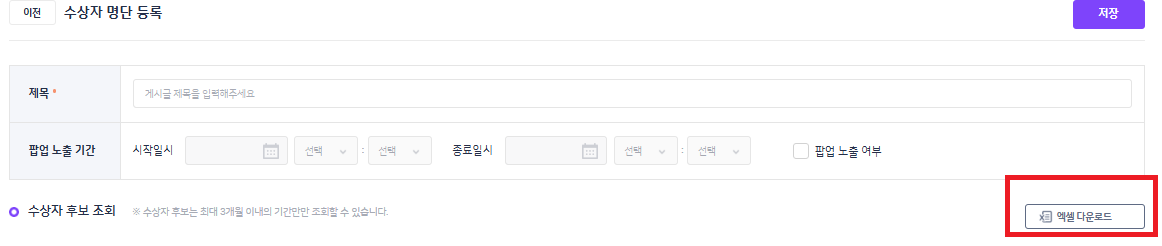 | Steps To Reproduce | 1. 플랫폼 BO 로그인 2. 서비스 > 명예의 전당 관리 > 수상자 명단 등록 > 엑셀 다운로드 버튼 | ||||