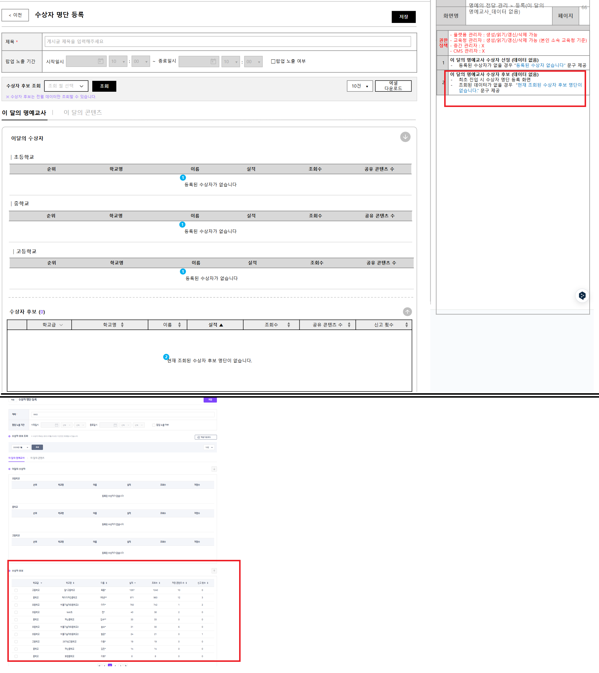 | Description | 수상자 명단 등록 페이지 진입시 데이터 노출되는 현상 최초 진입시에는 모든 데이터가 미노출이다가 [조회] 버튼 클릭시 수상자 후보가 노출되어야 합니다. | ||||