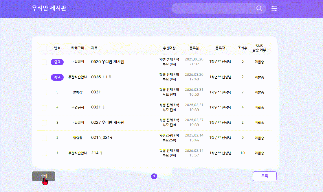 | Steps To Reproduce | 나의 학교 > 우리반 게시판 > 게시글 체크하지 않고 삭제 버튼 클릭 > 팝업 클릭 | ||||