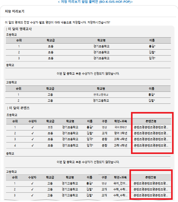 | Steps To Reproduce | 1. 플랫폼 BO 로그인 2. 서비스 > 명예의 전당 관리 > 등록 > 저장 미리보기 팝업 (팝업 노출 여부 '선택' 상태에서 저장 버튼 클릭 시, 호출) | ||||