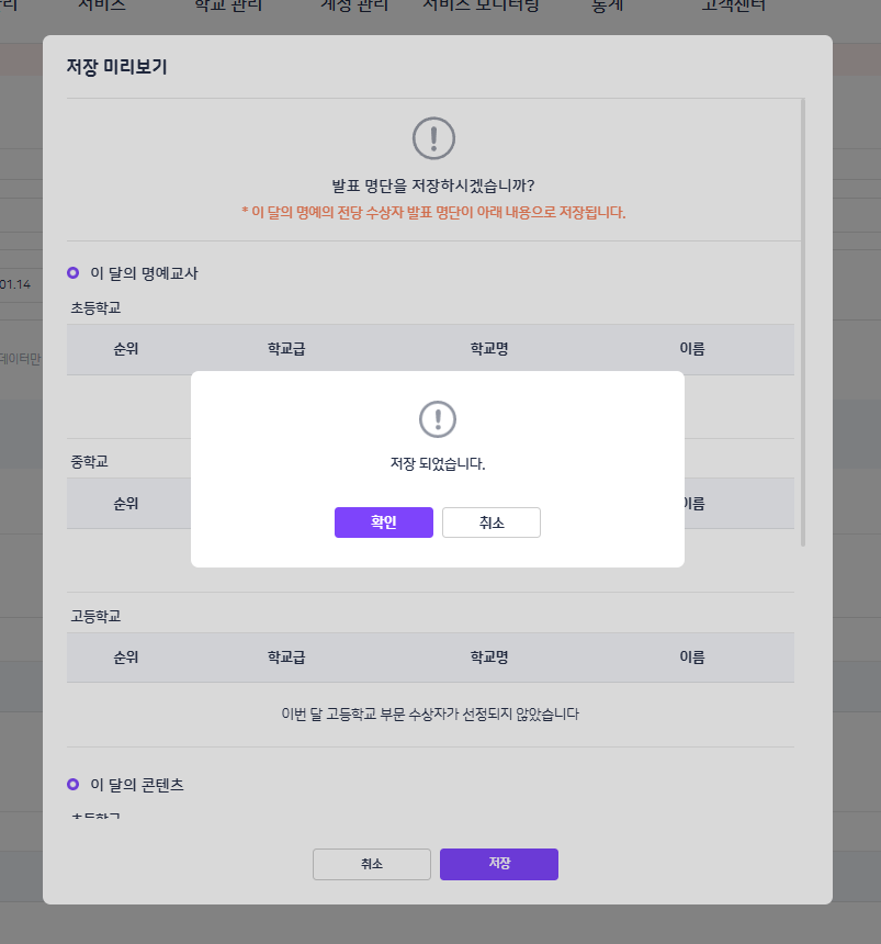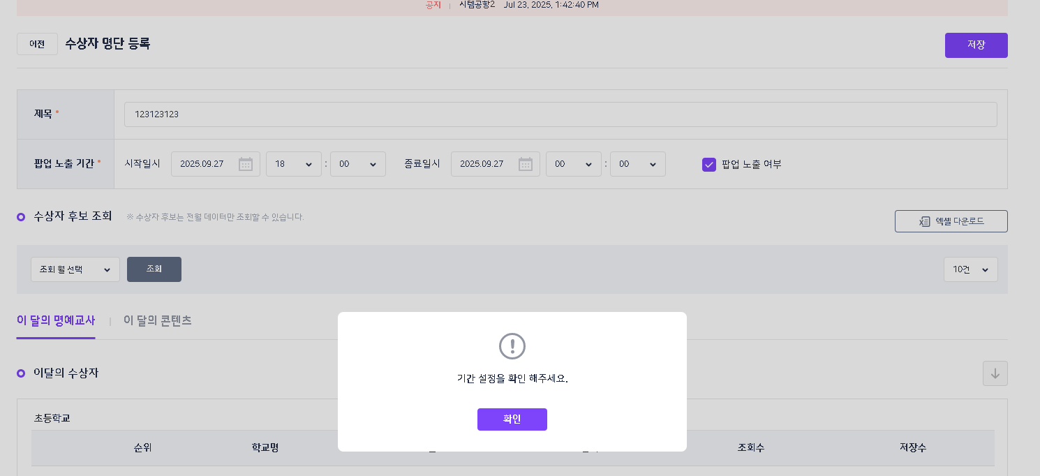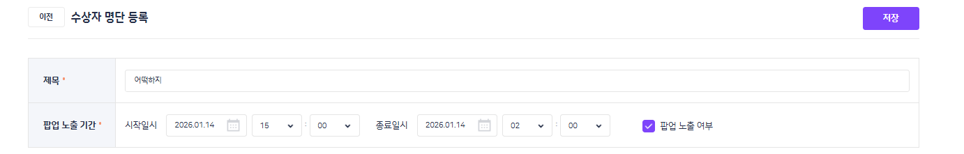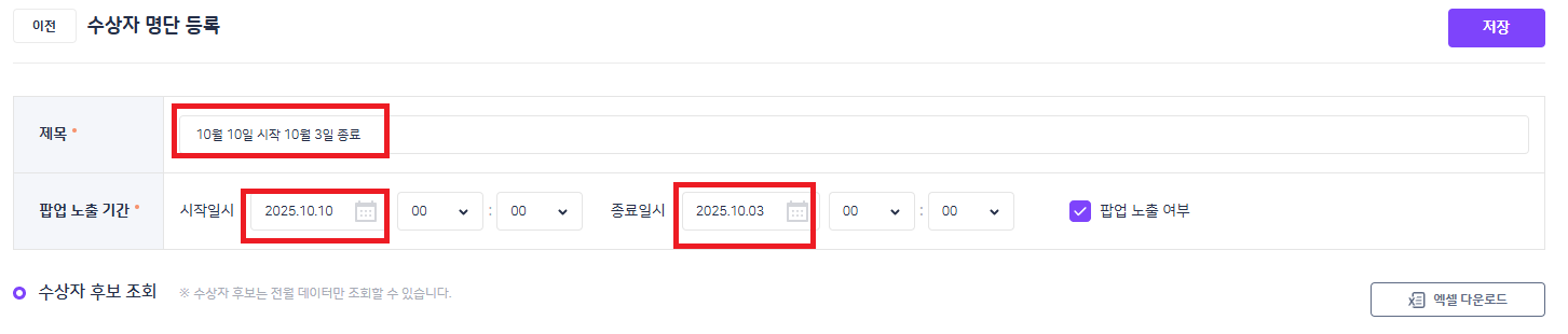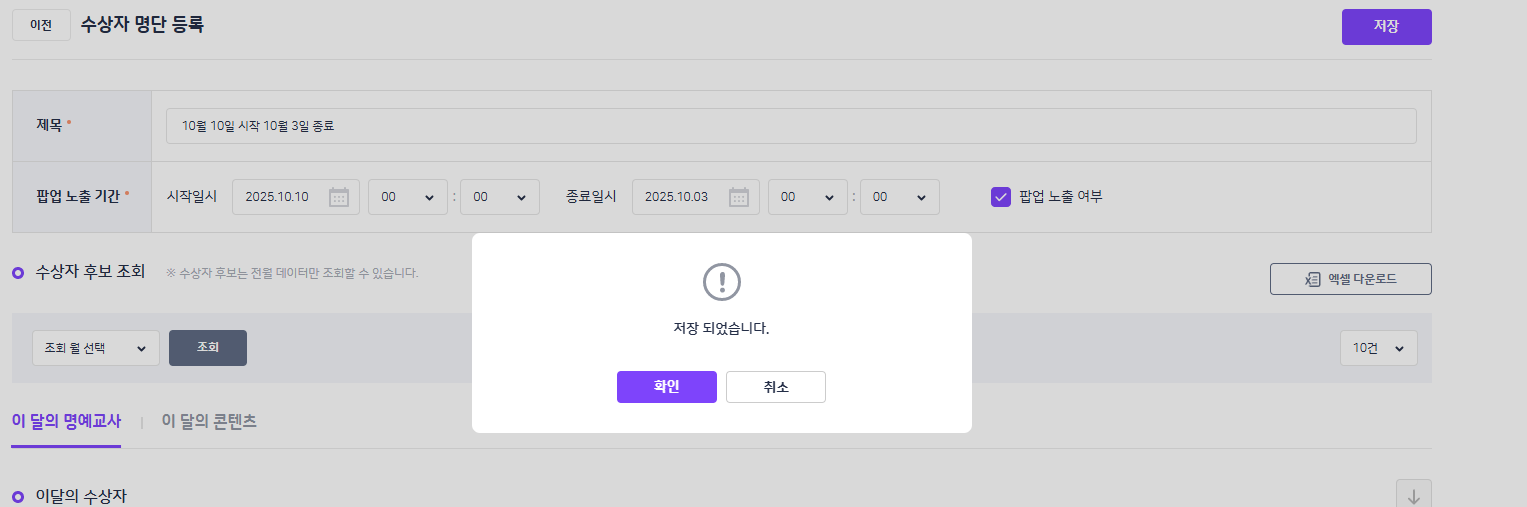 | Description | 수상자 명단 등록 : 시작일시(10월10일), 종료일시(10월3일)인데도 저장되는 현상 | ||||