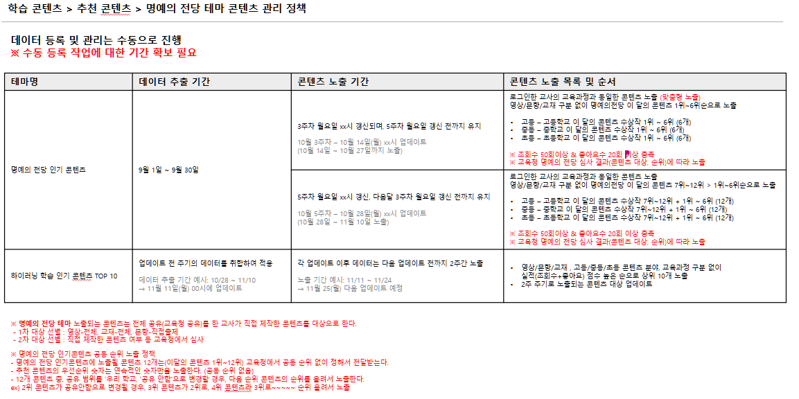 | Description | 플랫폼BO - 명예의 전당 관리 팝업 설정 기간 및 FO 명예의 전당 인기 콘텐츠 노출 정책 확인 필요 명예의 전당 팝업 설정 = 기간에 따른 콘텐츠 노출 → 1~6위 노출 → 7~12 + 1~6위 노출 팝업 노출 기간이 겹치지 않게 짧게하여 2번이상 다른 팝업을 노출 시킬경우 FO 명예의 전당 인기 콘텐츠가 어떻게 노출되는지 혹은 노출되어야 하는 기간보다 팝업이 짧게 설정되어 종료될 경우 FO 명예의 전당 인기 콘텐츠가 유지되어야 하는지 정책 확인이 필요합니다. | ||||