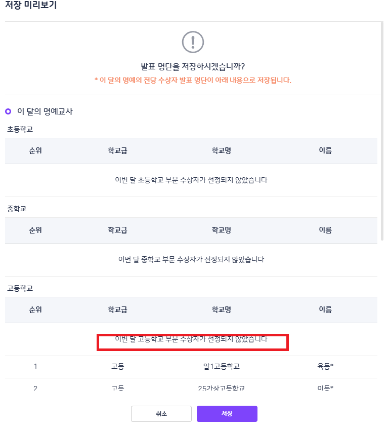 | Steps To Reproduce | 1. 플랫폼 BO 로그인 2. 서비스 > 명예의 전당 관리 > 수상자 명단 등록 > 이 달의 명예교사 : 고등학교 교사만 선택 > 저장 > 저장 미리보기 팝업 | ||||