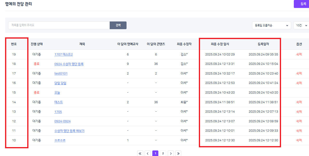 | Description | 명예의 전당 관리 목록 '번호' 컬럼 잘못 적용되어 있는 현상 | ||||