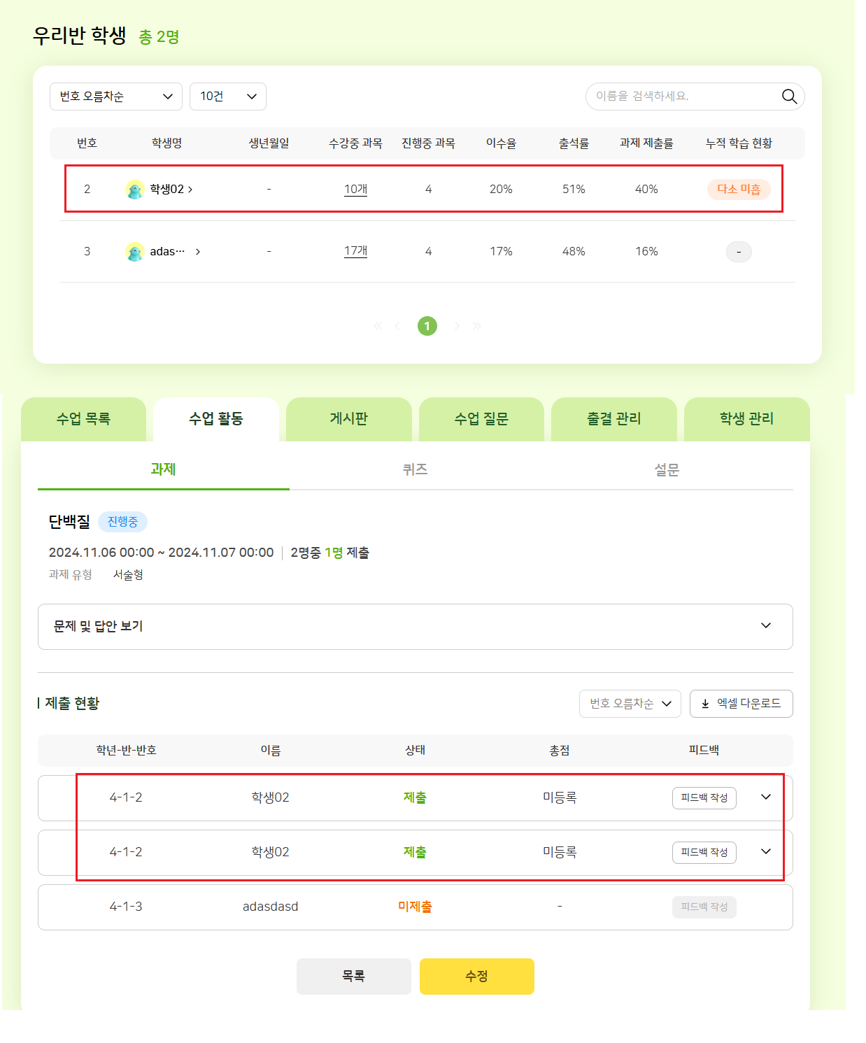 | Steps To Reproduce | 1. 교사 로그인 2. 나의 학교 > 나의 교실 > 우리반 학생 목록 확인 3. 나의 학교 > 나의 수업 > 수업 활동 > 과제 > 과제 상세 > 제출 현황 > 학생 목록 확인 | ||||