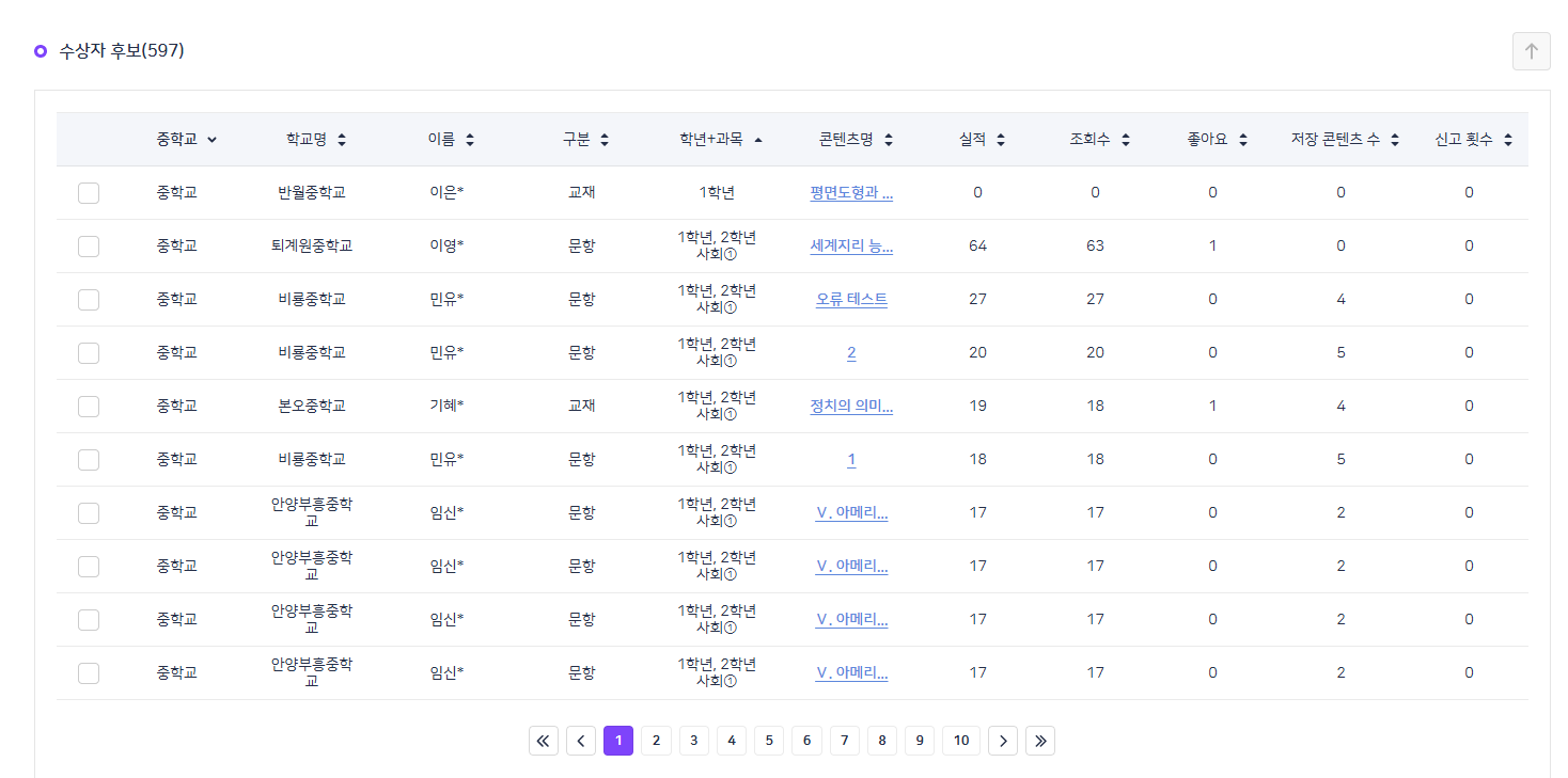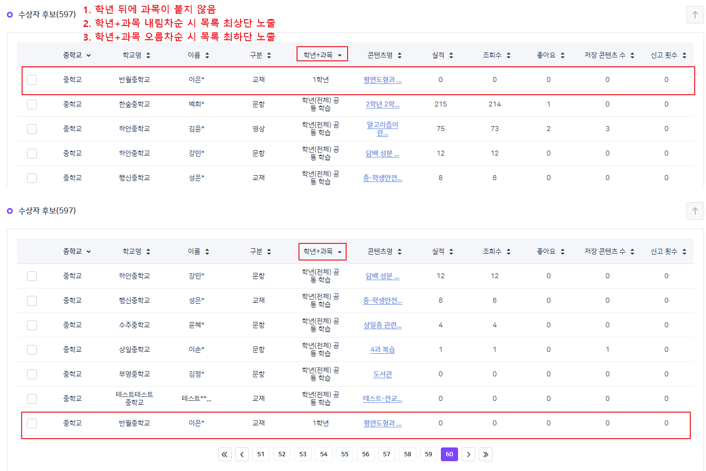 | Steps To Reproduce | 1. 수상자 명단 등록 화면 > 이 달의 콘텐츠 탭 클릭 2. 2025년 8월 조회 3. 수상자 후보 > 학급을 중학교, 학년+과목을 내림차순으로 설정 4. 반월중 / 교재 / 평면도형과... 자료 확인 | ||||