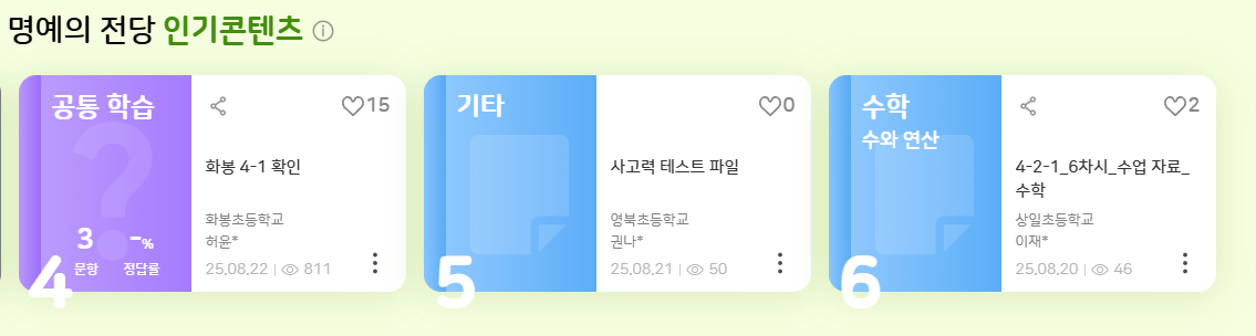 | 2025-09-25 15:39 | 이세희 | Summary | 명예의 전당 인기콘텐츠에 올라온 교재 클릭 시, 401에러 노출되며 반응 없는 현상 => 명예의 전당 인기콘텐츠에 올라온 교재 클릭 시, 401에러 노출되며 반응 없는 현상(초등만) |
