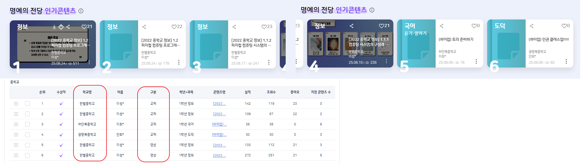 | Steps To Reproduce | 1. 플랫폼BO 진입 2. 수상자 관리 페이지 진입 3. 순위 확인 4. FO 명예의 전당 인기콘텐츠 영역 확인 (중학교) * 스크린샷 참조 | ||||