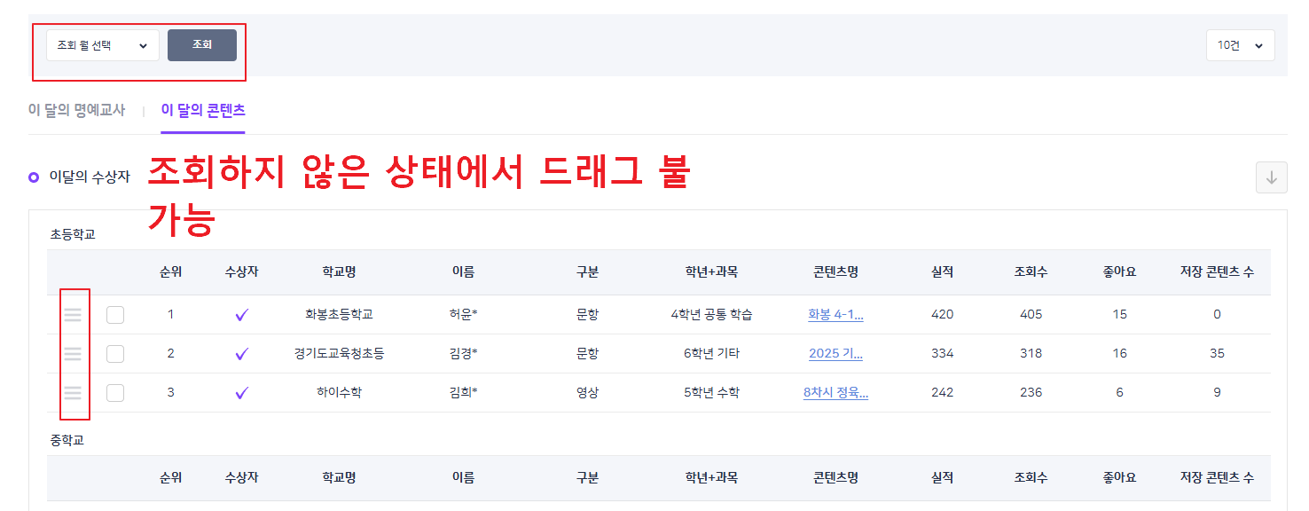 | Description | 수상자 명단 수정 화면에서 월 조회 하기 전 일 경우, 이달의 콘텐츠 탭 내 이달의 수상자 순위 변경 기능(햄버거 표시 영역 드래그)이 동작하지 않는 현상입니다. | ||||