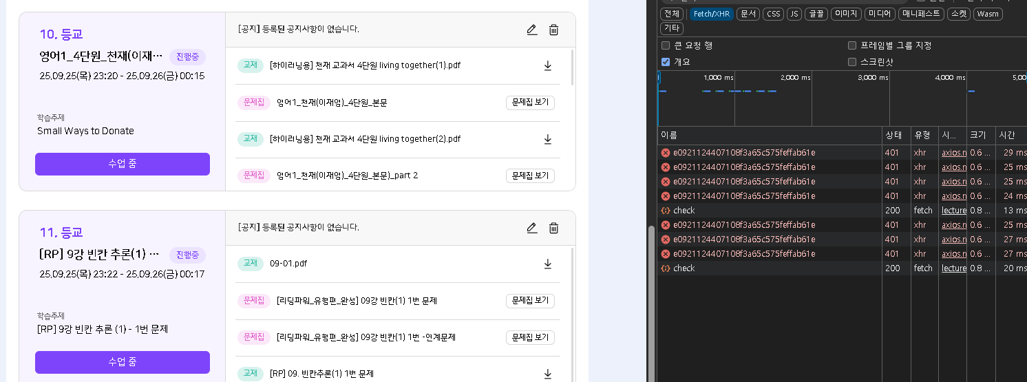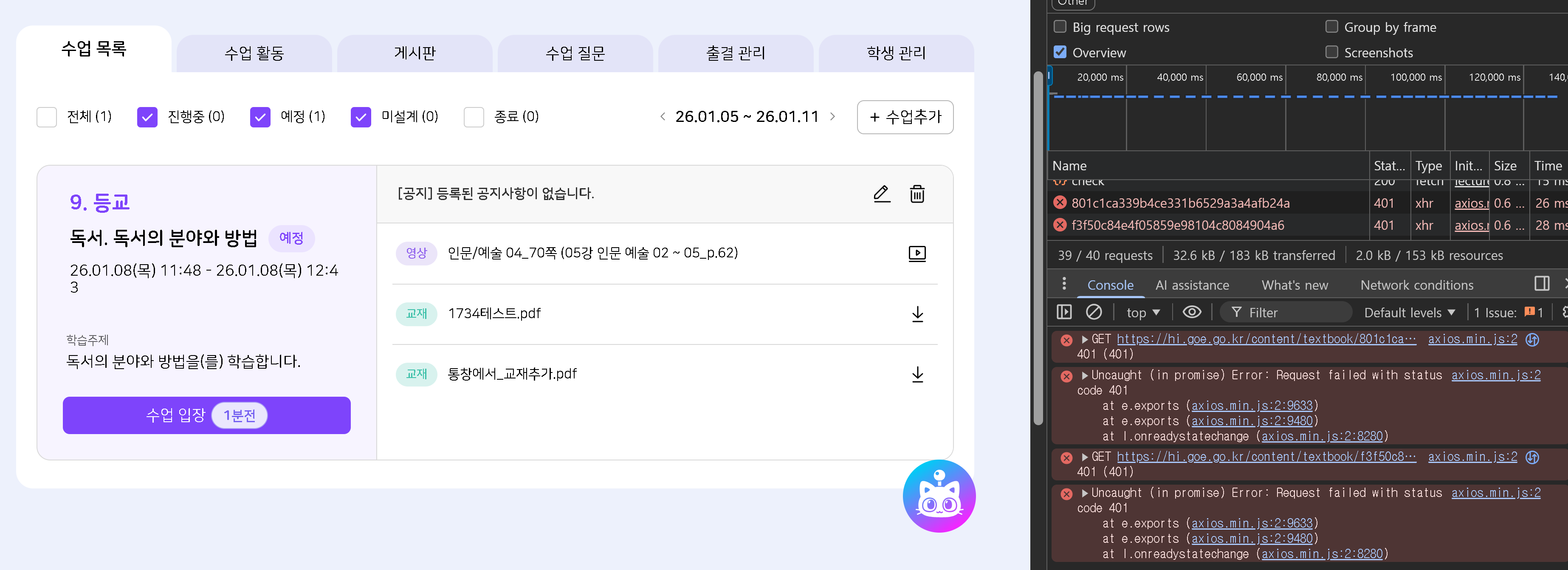 | Description | 수업 설계안 가져오기 - 전체 학교 수업 설계안으로 생성한 수업에 교재를 다운로드 시도시 401 error 발생 A교사가 전체 공개로 수업 생성시 직접 추가, 통창에서 추가한 교재 -> B교사가 수업 설계안 가져오기로 수업 생성한 후 교재 다운로드 시도시 에러가 나는 현상입니다. A교사가 전체 공개로 수업 생성시 교재 콘텐츠 조회 - 전체 공개로 설정된 교재 추가 후 수업 생성 -> B 교사가 수업 설계안 가져오기로 수업 생성 후 교재 다운로드시 다운로드 성공 | ||||