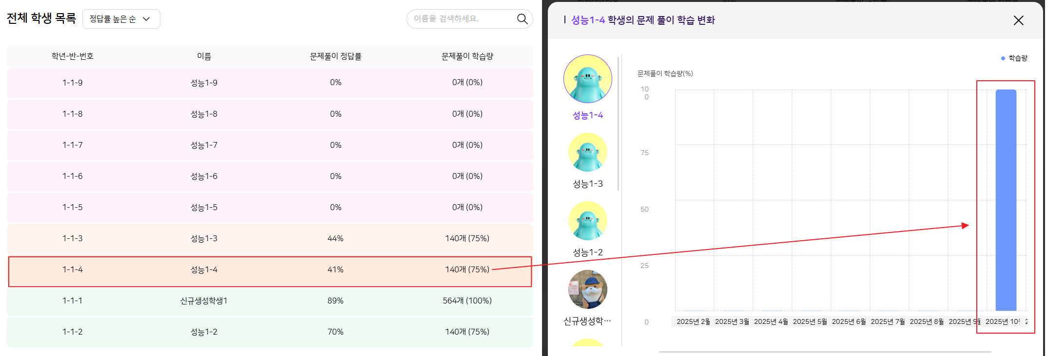 | Steps To Reproduce | 1. TB > 25test1 교사 로그인 2. AI 리포트 - 학생 리포트 메뉴 진입 3. 전체 학생 목록 > 성능 1-4 학생 학습량 확인 (75%) 4. 성능 1-4 학생 클릭 5. 학습량이 100%로 노출됨을 확인 | ||||