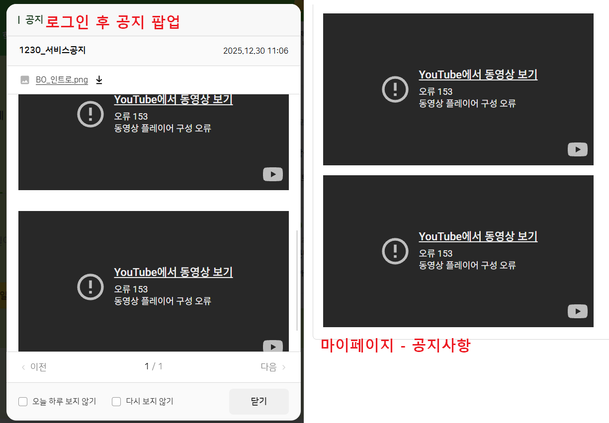 | Description | 공지 팝업에서 유튜브 플레이어가 다음과 같이 비정상 동작하는 현상입니다. 1. 비로그인, 로그인 공통 발생 : 유튜브 플레이어가 내용(텍스트, 이미지)보다 윗 레이어로 노출되어 내용과 겹쳐서 노출 됨 2. 로그인 상태 : 유튜브 153 에러 발생 | ||||