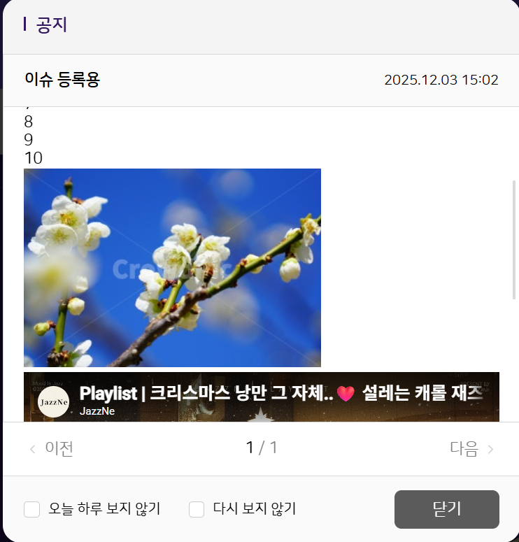 | 2025-12-30 06:01 | 최용운 | Summary | 공지 팝업에서 유튜브 플레이어가 비정상 동작하는 현상 => [에디터] 공지 팝업에서 유튜브 플레이어가 비정상 동작하는 현상 |