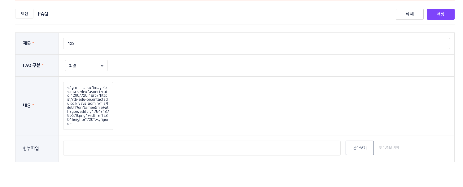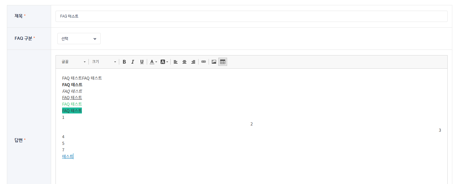 TB에서 FAQ 내용 입력 영역이 다른 영역과 동일한 너비로 노출되며, 에디터 UI 노출 및 기능 적용 확인했습니다. |