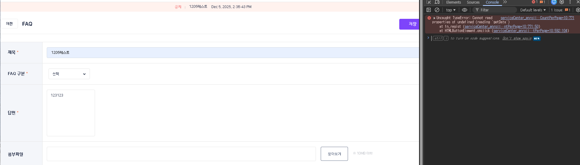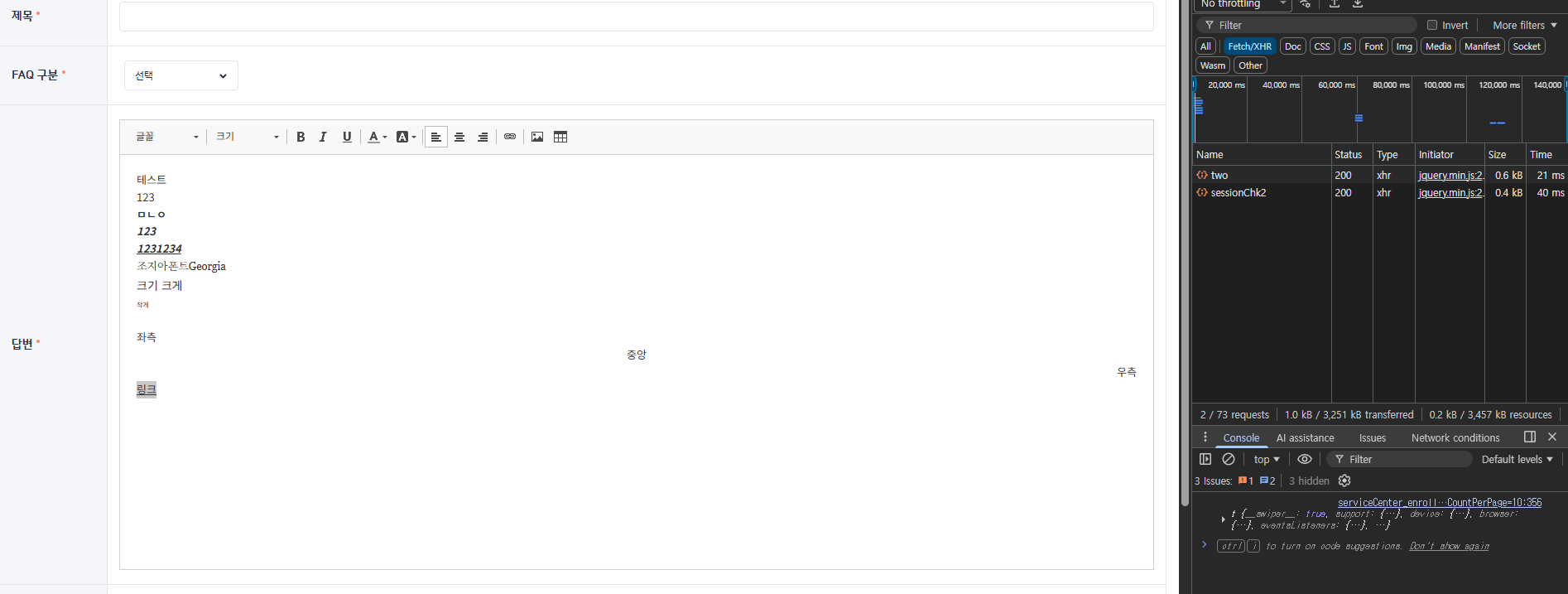 | Description | 플랫폼 BO - 고객센터 - FAQ 등록 시 답변 입력 영역 줄어듬 & 저장 안되는 현상 1. FAQ 등록 시 답변란 영역 줄어드는 현상 2. FAQ 등록 시 console에 error 노출되며 저장 안되는 현상 3. 이미 작성된 FAQ 상세 클릭시 내용란 영역 줄어듬 | ||||