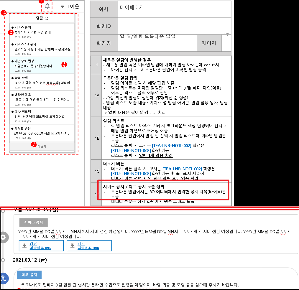 | Description | 마이페이지 - 알림 기획 문의 드립니다. 1. 1D : 서비스 공지, 학교 공지는 알림 팝업에서 제목만 노출되어야 한다고 기입된 부분 문의 드립니다. > 알림을 클릭 했을 때 이동되는 알림 페이지에는 공지 제목은 노출되지 않고 내용만 노출되고 있습니다. 기획대로 알림 드롭다운 팝업에서만 제목으로 노출되면 될지 문의 드립니다. 2. "1B : 드롭다운 팝업에서 알림 탭 선택 시 알림 리스트에 미확인 알림만 노출" 부분 이해하지 못하여 문의 드립니다 > 드롭다운 팝업에서 클릭 할 수 있는 '알림 탭' 부분이 있어야 하는지 문의 드립니다. | ||||