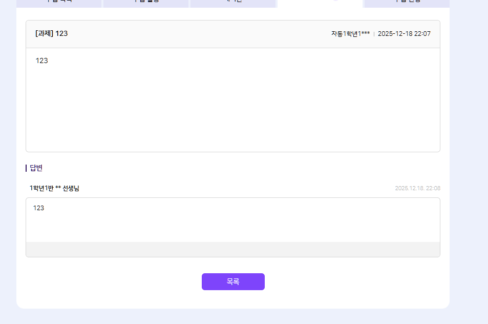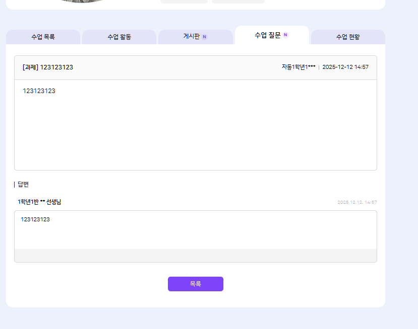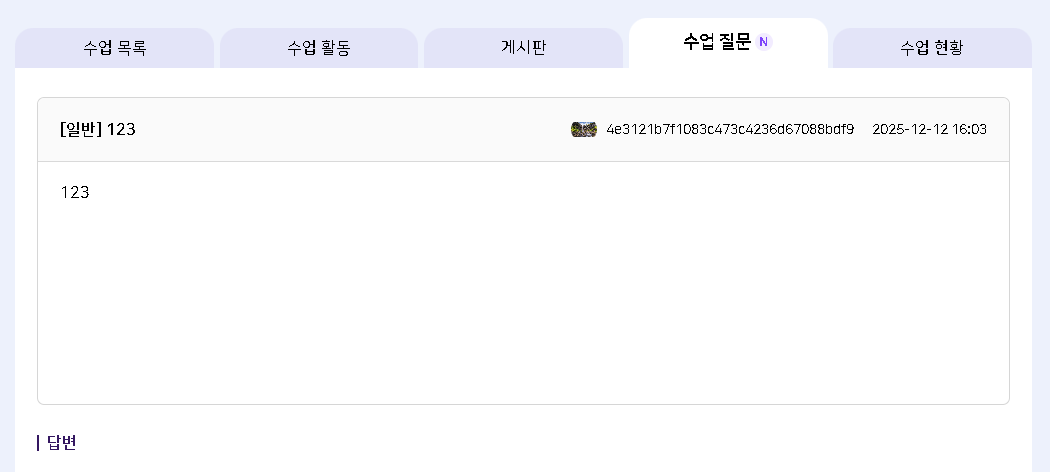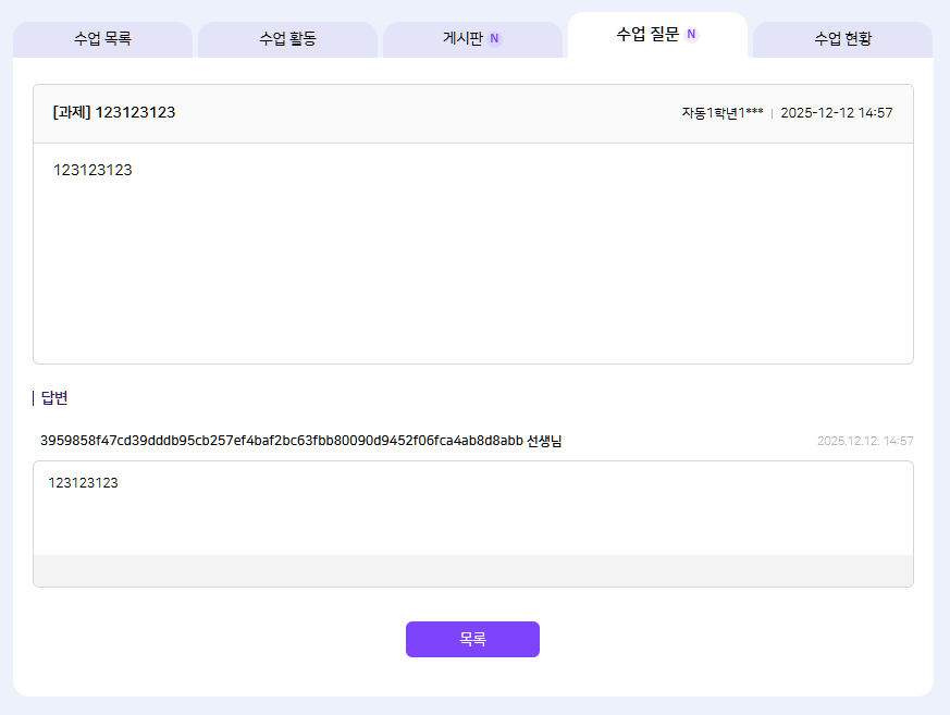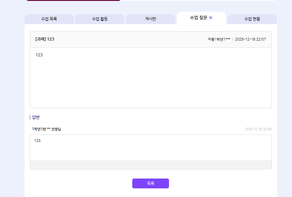 | Description | [암호화][FO][PC/모바일] 나의 학교 > 나의 수업 > 과목 상세 > 수업 질문 > 교사 답변 > '답변자' *기대결과 : 답변자 마스킹 | ||||