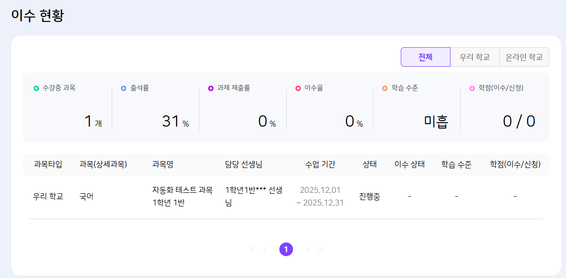 | Description | 나의 학교 > 나의 교실 > 이수 현황 - 담당 선생님 학생만 | ||||