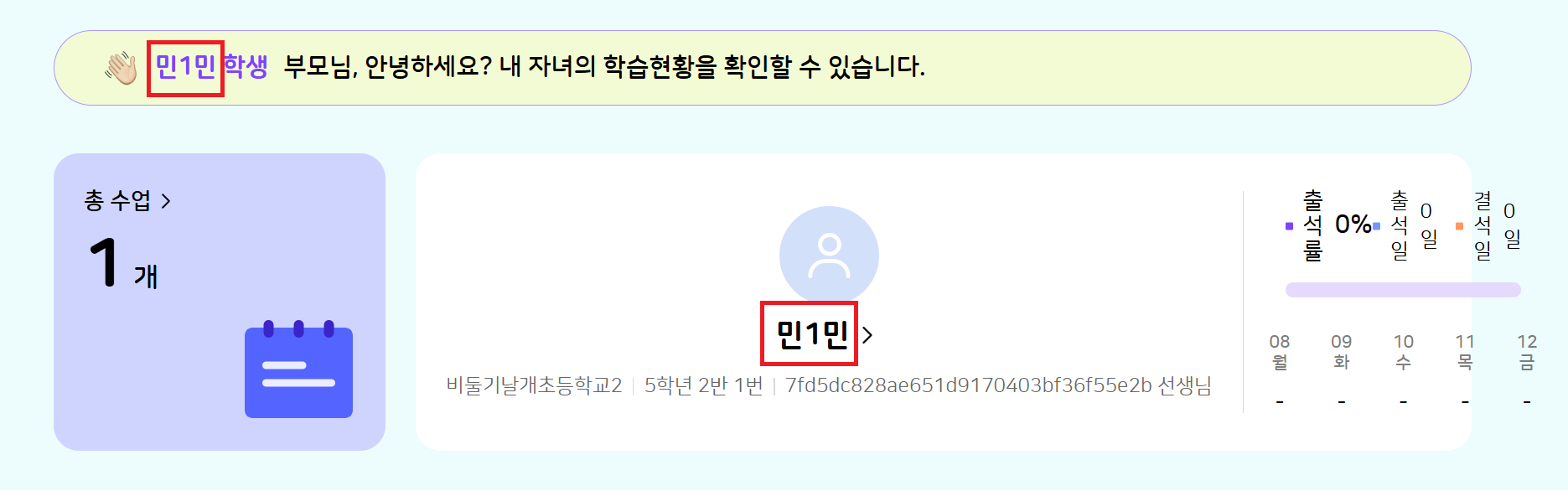 | Description | [암호화][FO][PC/모바일] 학부모 > 메인 > 대시보드 상단 > 자녀명 평문 노출 | ||||
