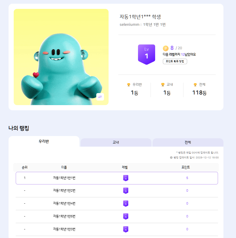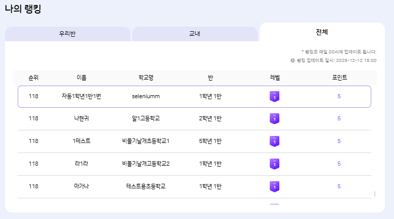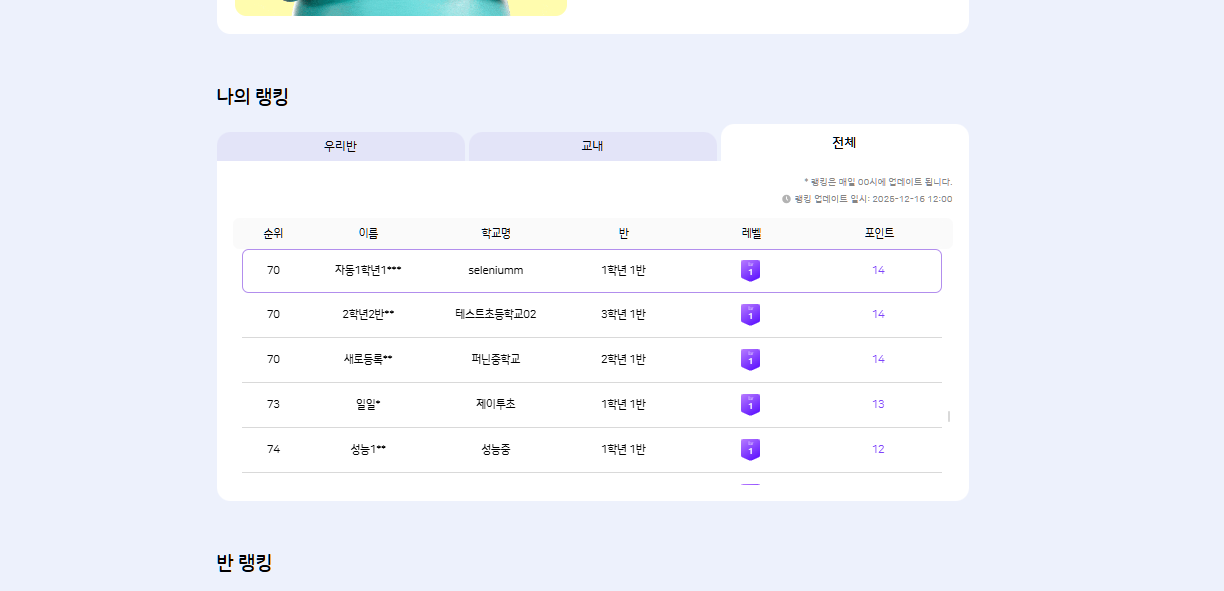 | Description | [암호화][FO] 나의 프로필레벨 > 나의 랭킹 - 학생 이름 평문 노출 | ||||