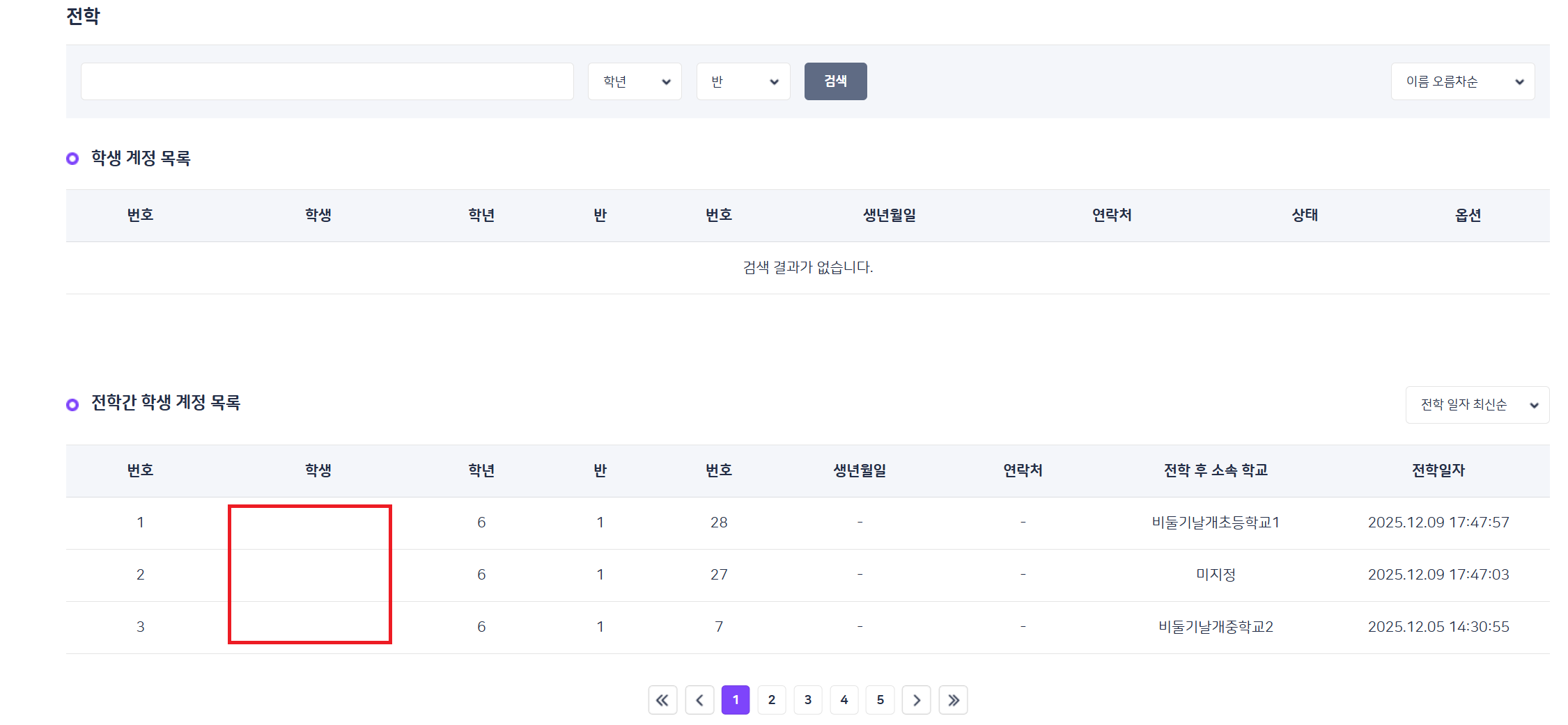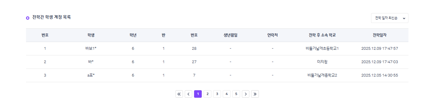 | Description | [암호화][학교BO] 계정관리 > 전학 > 전학간 학생 계정 목록 > 학생명 | ||||