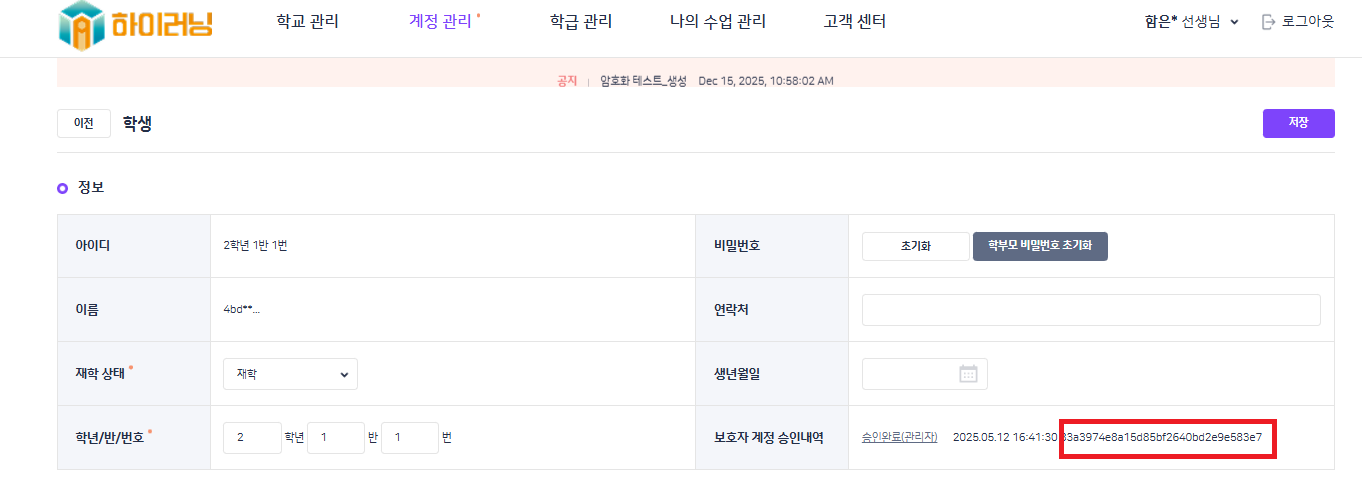 | Summary | 0001806: [암호화][학교BO] 계정 관리 > 학생 > 학생 상세 > 보호자 계정 승인내역 | ||||