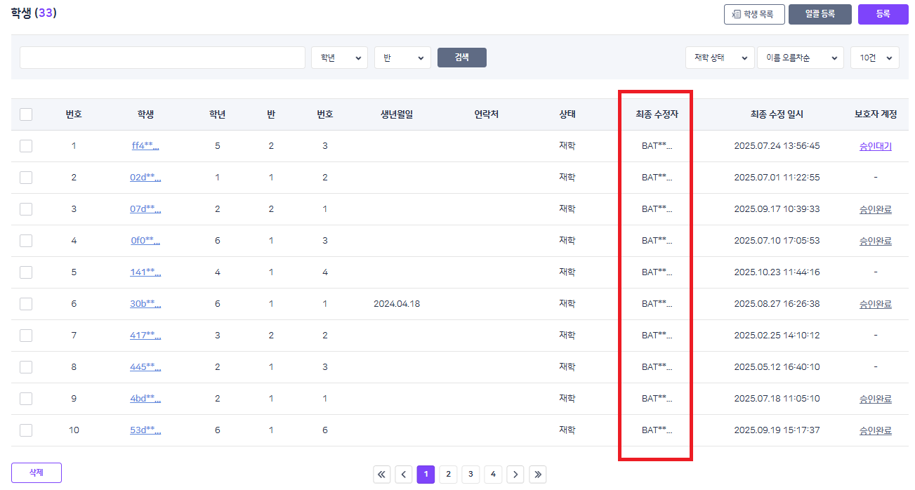 | Description | [암호화][학교BO] 계정관리 > 학생 > 최종 수정자명 | ||||