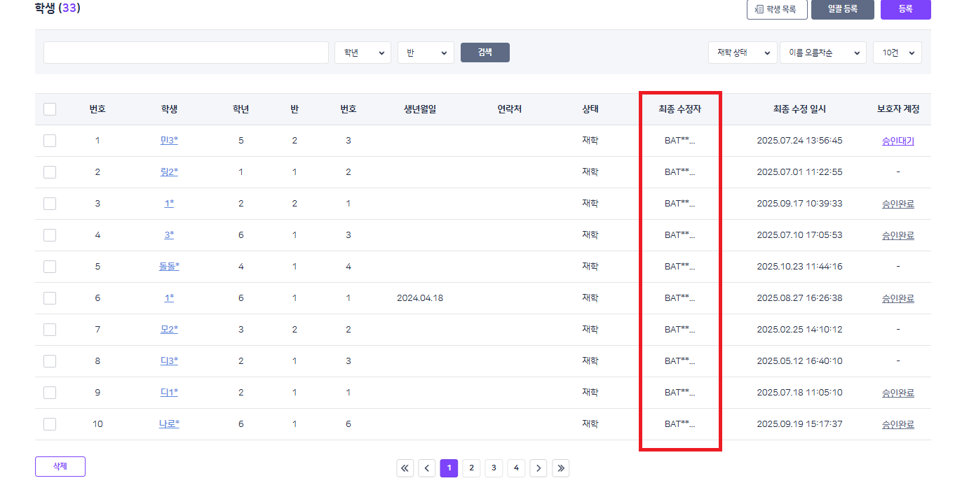 | Steps To Reproduce | 1. 학교 BO 로그인 2. 계정관리 > 학생 > 최종 수정자명 | ||||