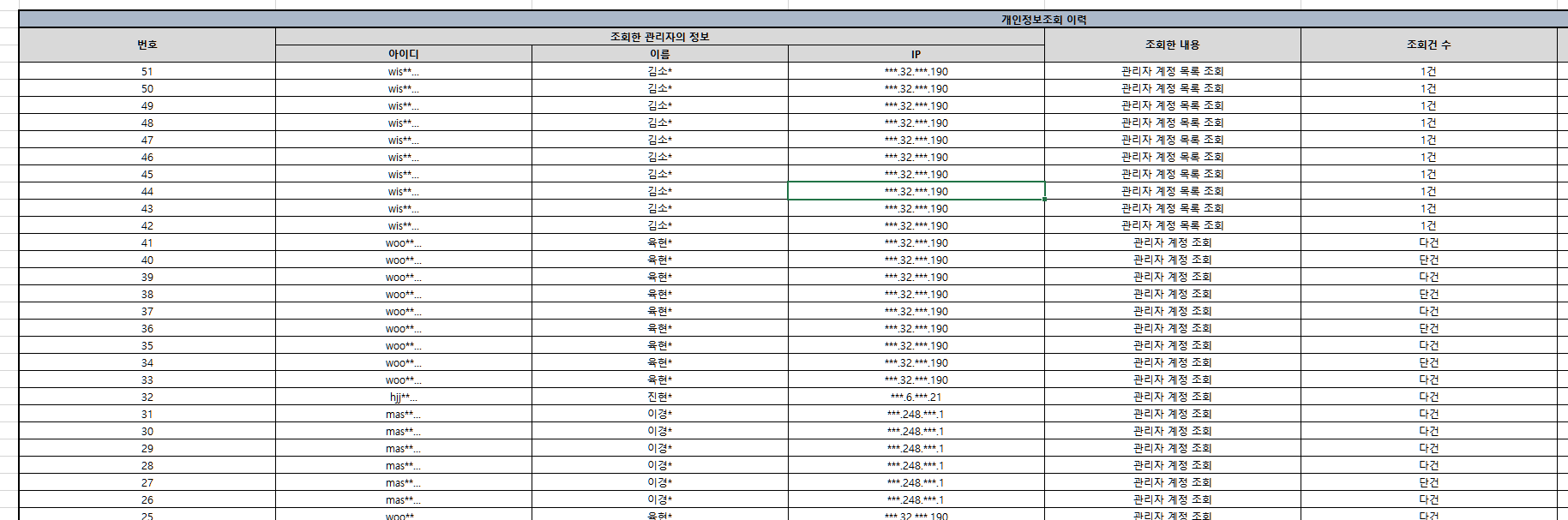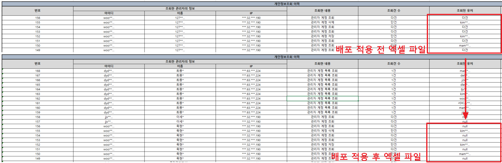 | Summary | 0001818: 개인정보조회이력 엑셀 파일에서 기존 다건 '조회된 관리자' 데이터가 null로 출력되는 현상 | ||||