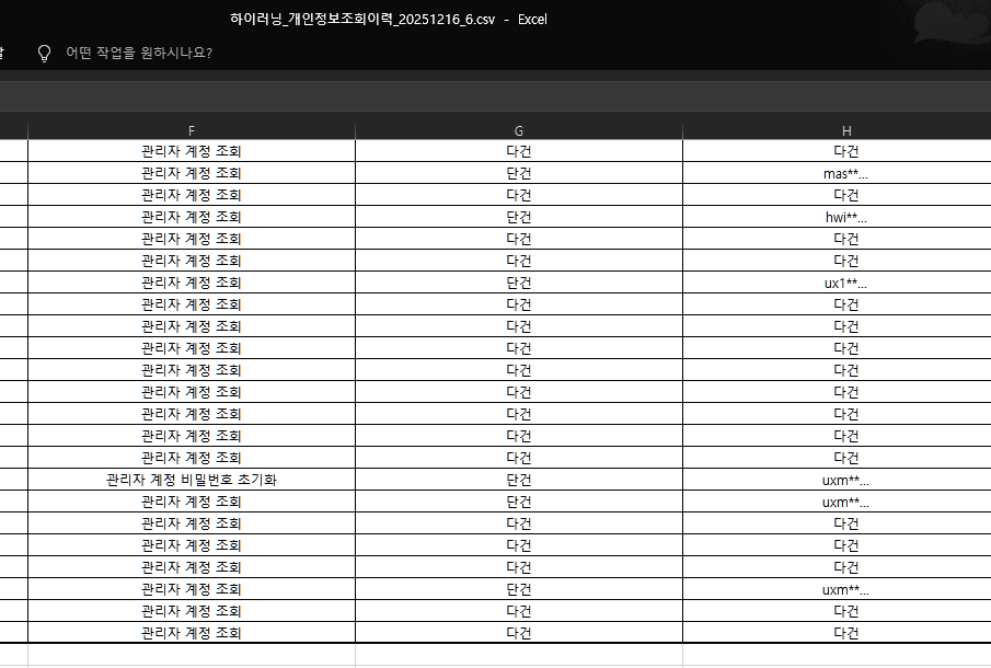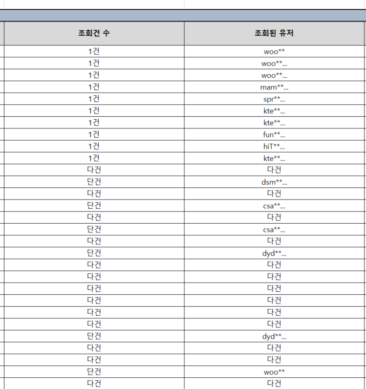 | Description | 개인정보조회이력 엑셀 파일에서 배포 적용 전 다건 로그의 '조회된 관리자' 값이 null로 출력되는 현상입니다. - 기대결과 : BO 화면과 동일하게 '다건'으로 노출되어야 합니다. | ||||