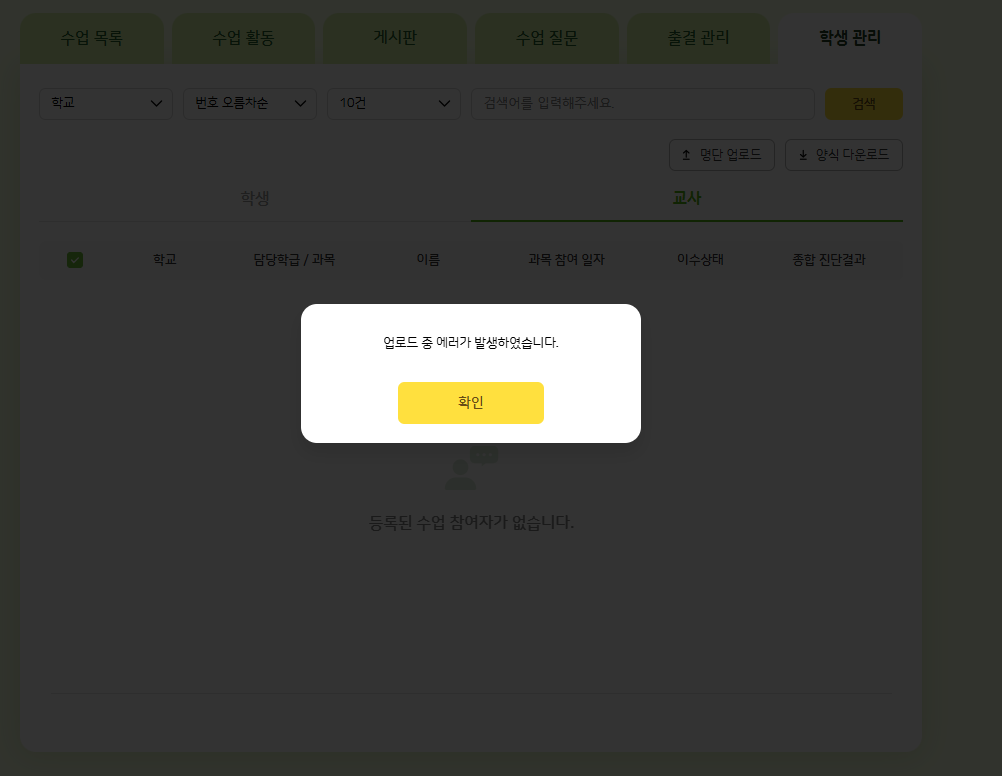 | Description | 과목 상세 > 학생 관리 화면에서 양식에 맞춰 [ 명단 업로드 ] 진행 시 에러 팝업 노출 | ||||
