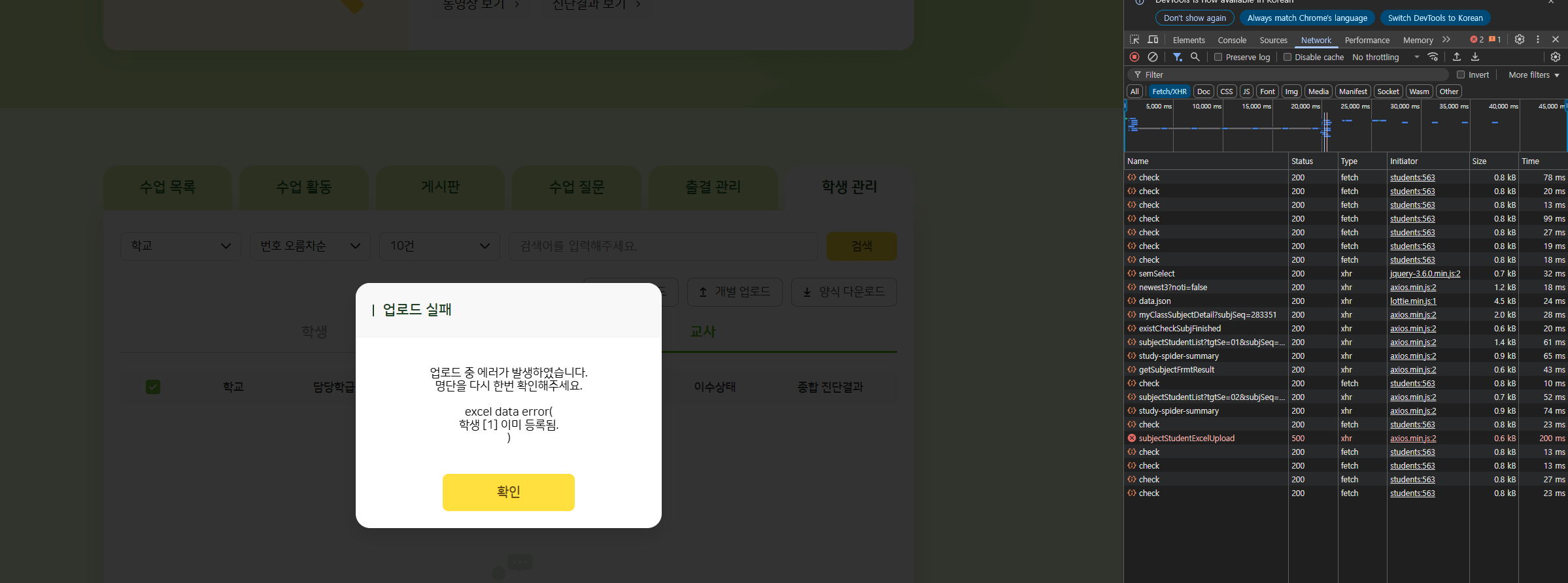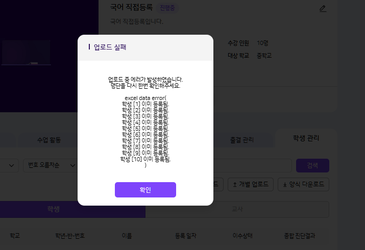 | Summary | 0000182: 과목 상세 > 학생 관리 화면에 [ 명단 업로드 ] 진행 시 에러 팝업 노출 | ||||