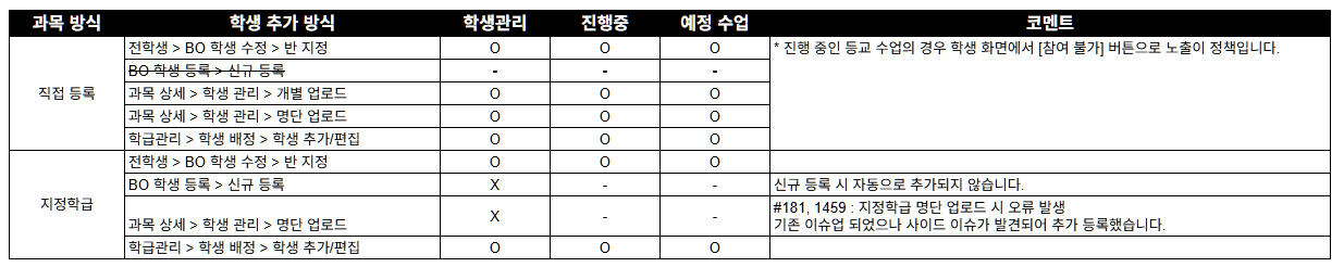 지정학급의 경우 이전부터 명단 업로드가 불가한 이슈가 있었습니다. * 진행중인 등교 수업의 경우 학생 화면에서 [참여 불가] 버튼으로 노출됩니다. |