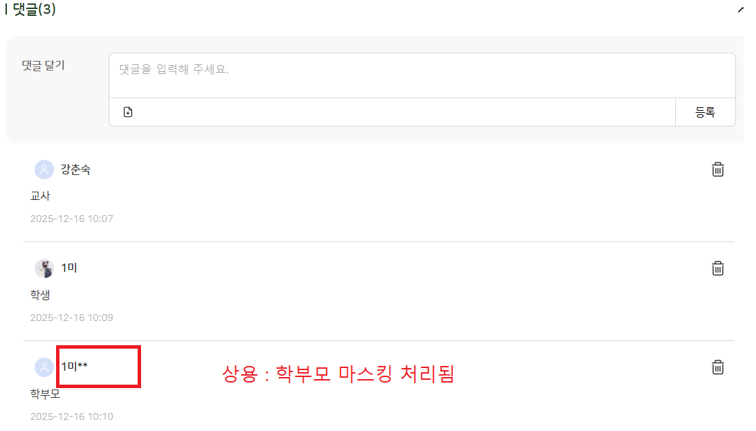 어떤 학부모는 마스킹되고 어떤 학부모는 마스킹이 안되는 것 같습니다 말씀주신대로 마스킹 안되는 것으로 확인하겠습니다 |