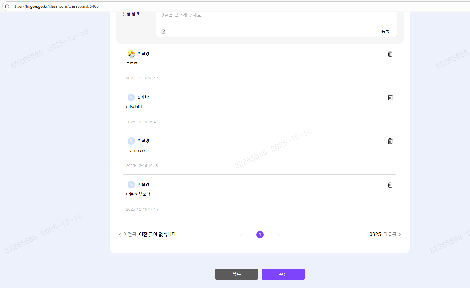 | 2025-12-15 08:52 | 이세희 | Summary | [암호화][FO] 우리반 게시판 > 게시글 상세 > 작성자(교사)/댓글(교사/학생/학부모) => [암호화][FO][PC/모바일] 교사/학생/학부모 : 우리반 게시판 > 게시글 상세 > 작성자(교사)/댓글(교사/학생/학부모) |