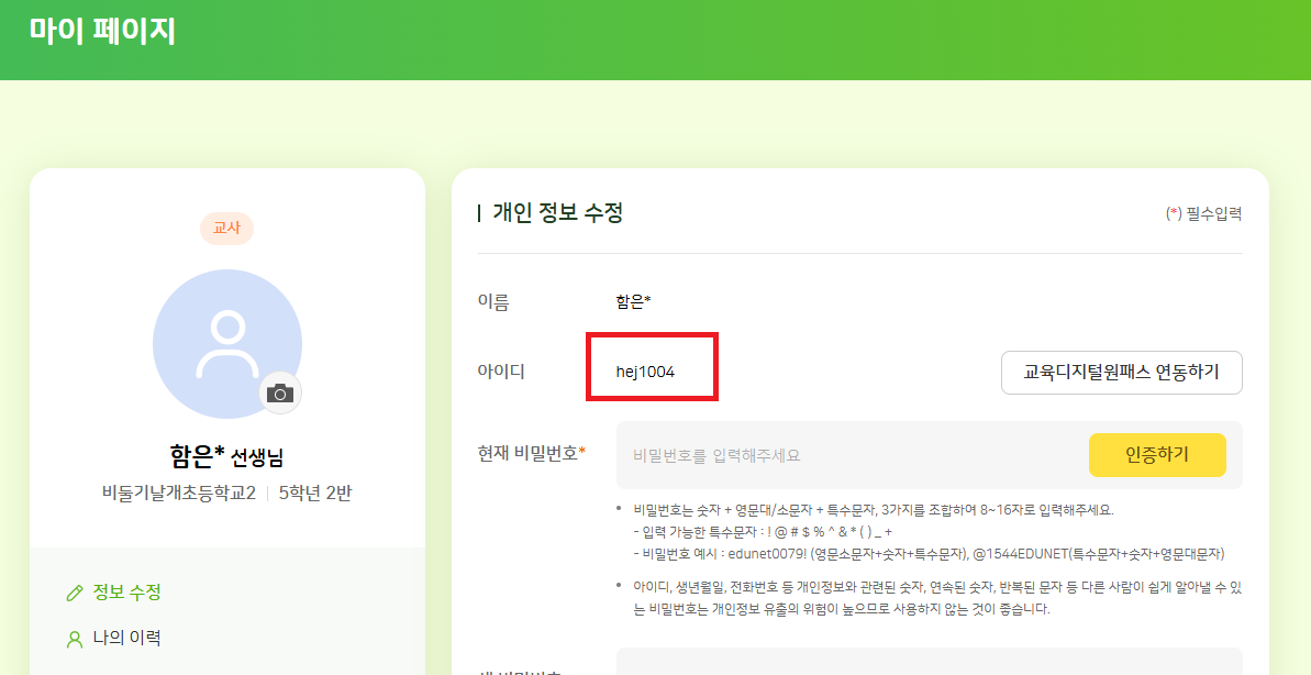 | Description | [암호화][FO] 교사 : 메인 > 마이페이지 > 정보 수정 > 아이디 | ||||