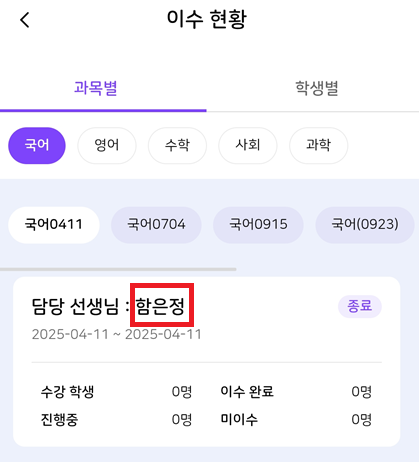 | Description | [암호화][FO][모바일] 교사 : 나의 교실 > 우리반 정보 > 더보기 > 과목별 이수현황 > 담당 선생님명 | ||||