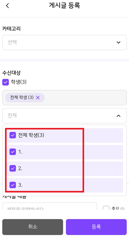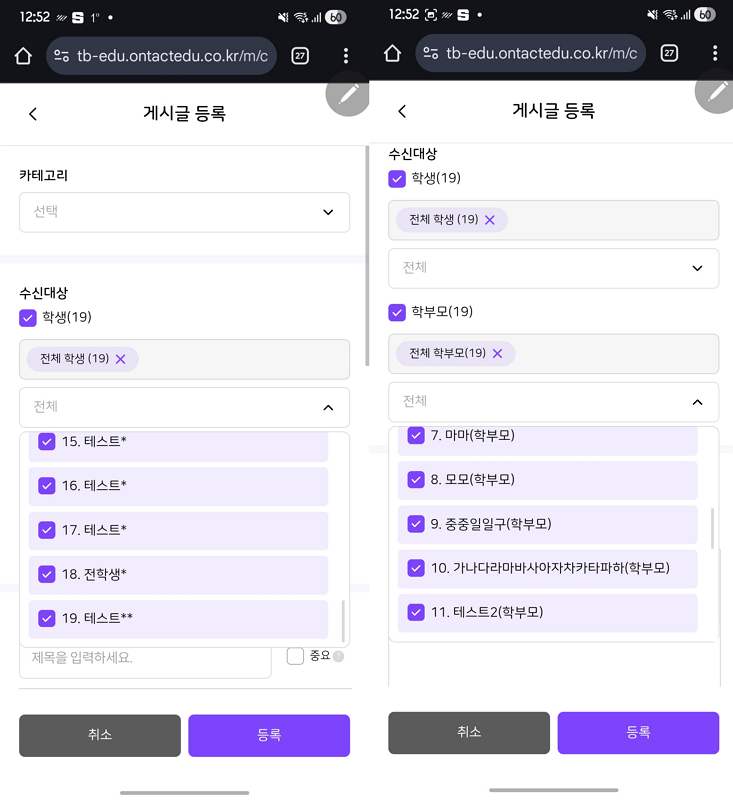 | Description | [암호화][FO][모바일] 교사 : 우리반 게시판 > 등록 > 수신대상 > 학생명 미노출 *상용/TB 공통 이슈 | ||||
