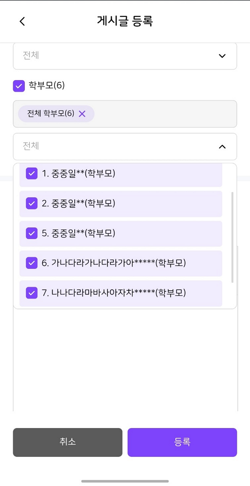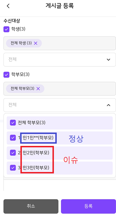 | Summary | 0001832: [암호화][FO][모바일] 교사 : 우리반 게시판 > 등록 > 수신대상 > 학부모명 | ||||