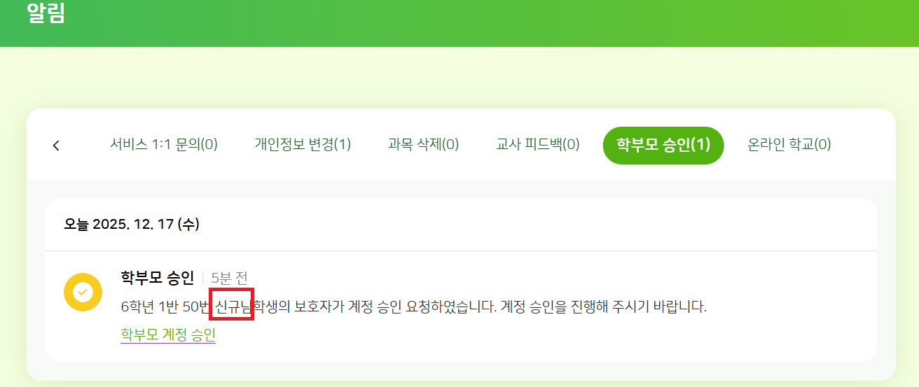 | Description | [암호화][FO][PC/모바일] 학생 : 학생의 보호자가 회원가입 신청 시 학생의 [알림]에 학생 이름 평문 노출 *상용/TB 공통 이슈 | ||||