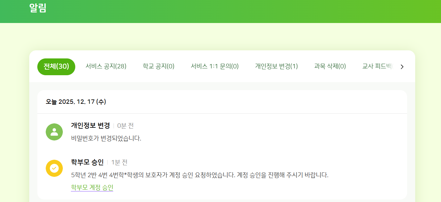 | Steps To Reproduce | 1. 학부모 회원가입(비둘기날개초등학교2 6-1-50) 2. 해당 학생 로그인(비둘기날개초등학교2 6-1-50) > 알림 | ||||