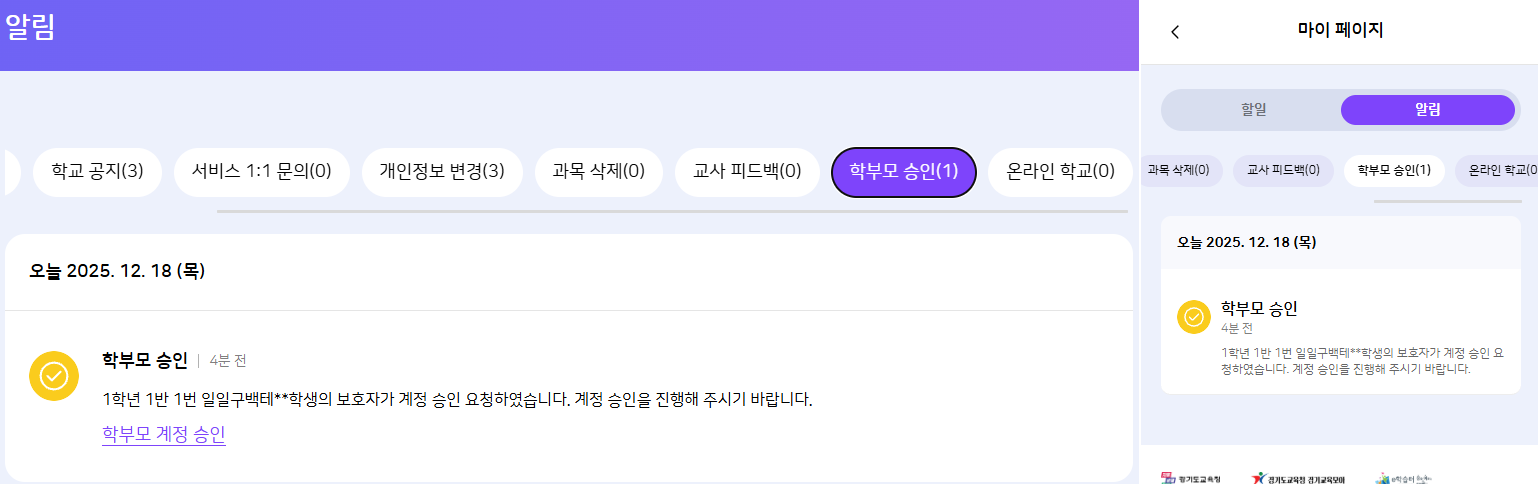 | Summary | 0001842: [암호화][FO][PC/모바일] 학생 : 학생의 보호자가 회원가입 신청 시 학생의 [알림]에 학생 이름 평문 노출 | ||||