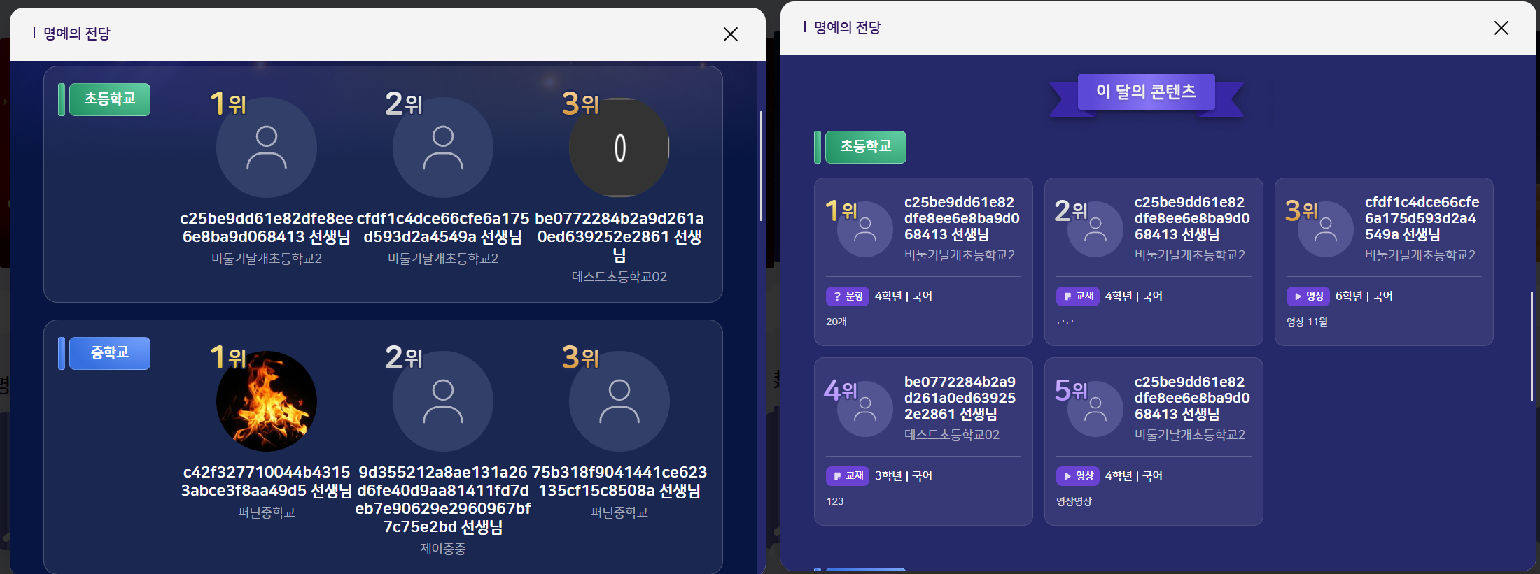 | Summary | 0001843: [암호화][FO] 명예의 전당 팝업 > 교사명 | ||||