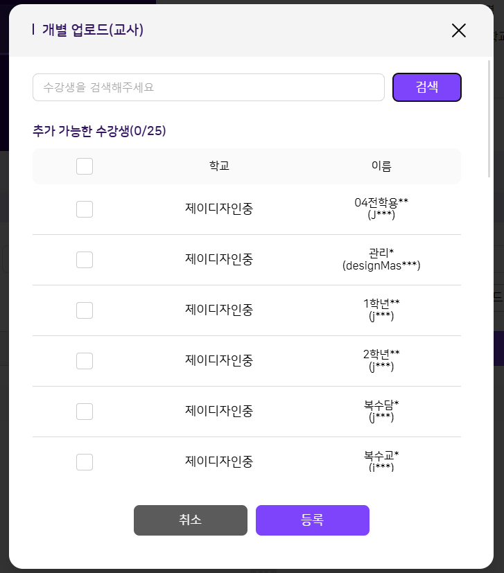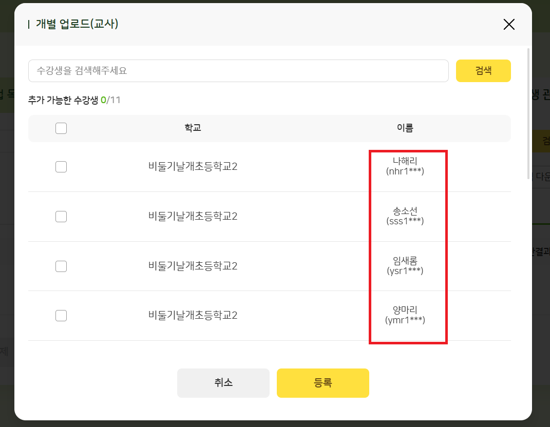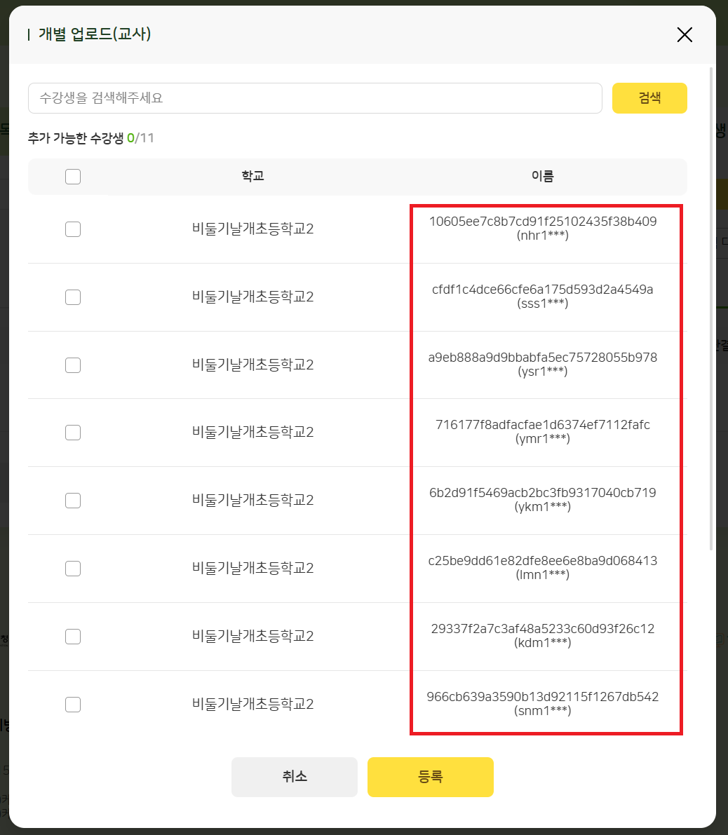 | Description | [암호화][FO] 교사 : 직접등록 학급 > 학생 관리 > 교사 탭 > 교사 개별업로드 팝업 > 교사명 *기대결과 : 교사명 마스킹 되어야 함 | ||||