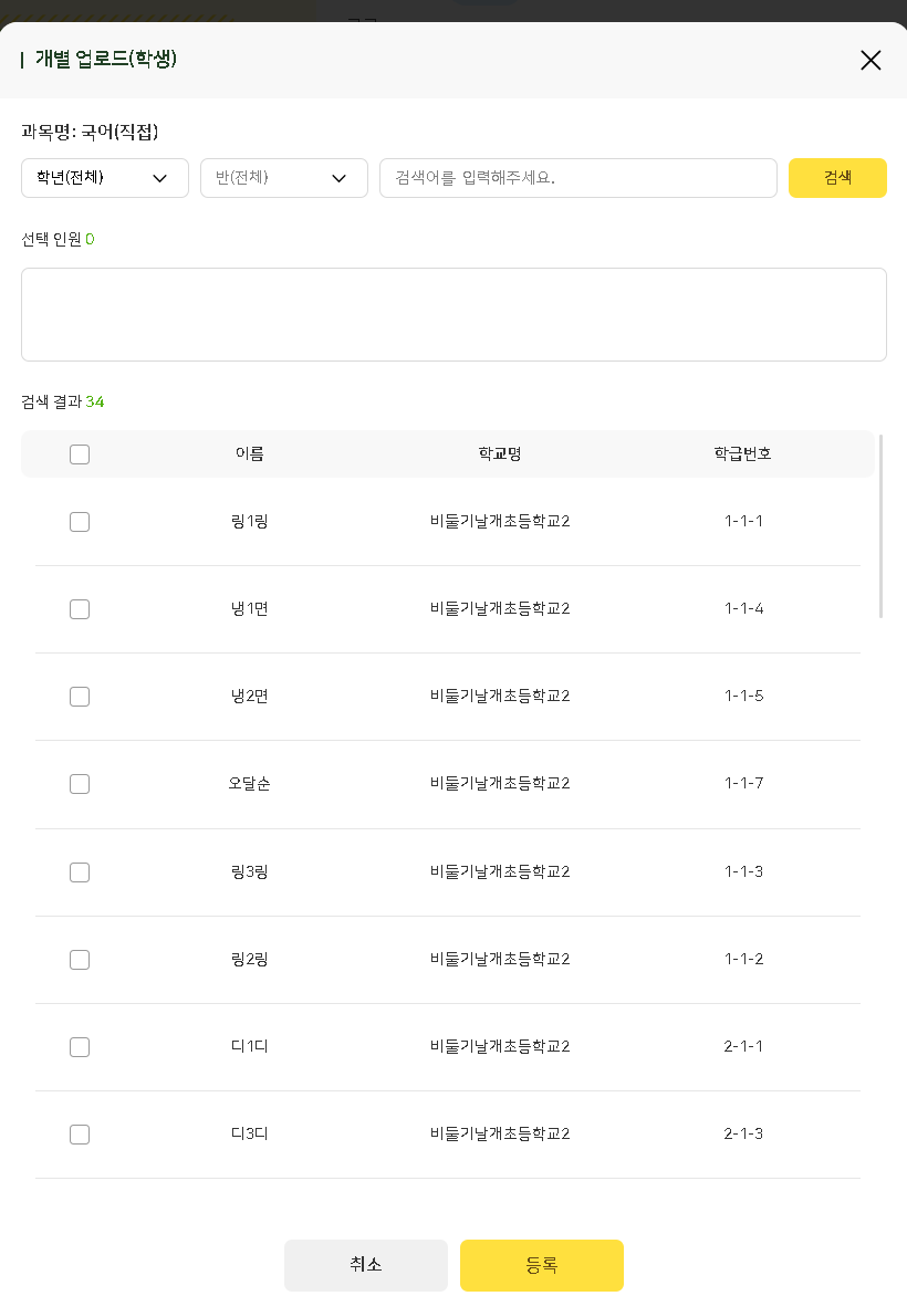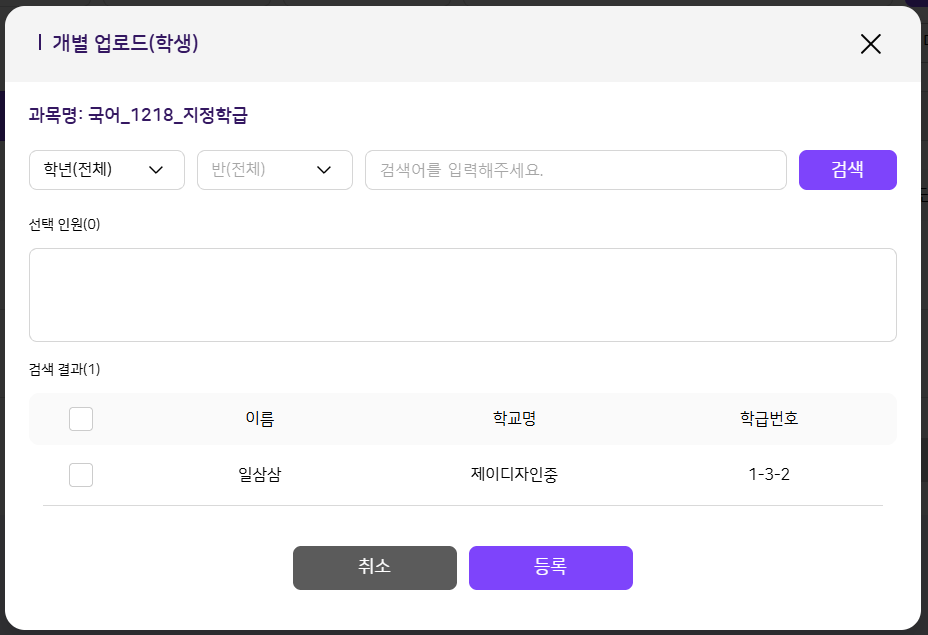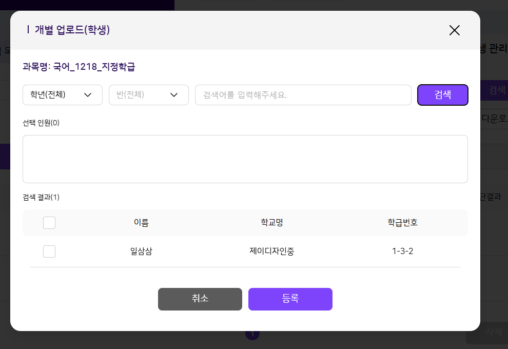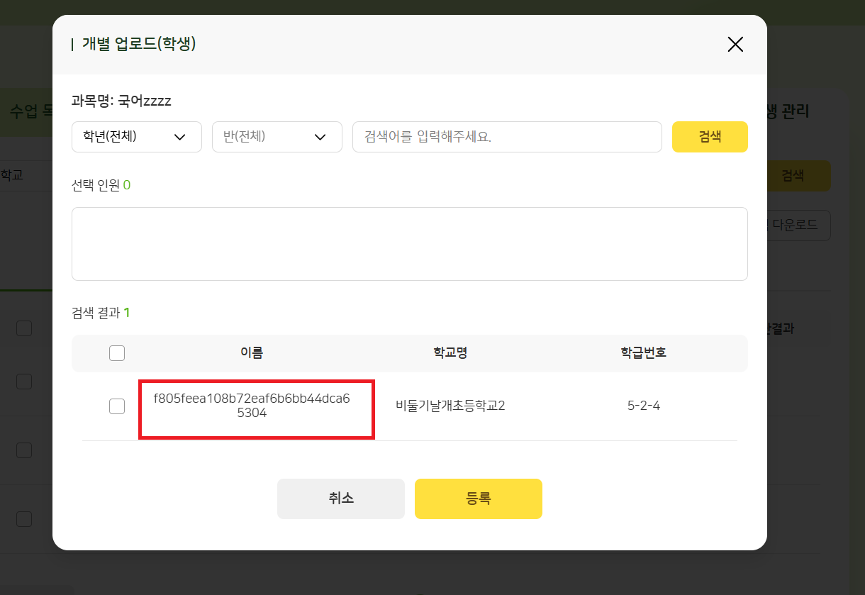 | Steps To Reproduce | 1. 교사 로그인 2. 나의 학교 > 나의 수업 > 직접등록으로 학급 개설 3. 학교BO에서 신규학생 등록 4. 학생 관리 > 학생 탭 > 학생 개별업로드 팝업 > 신규학생의 학생명 | ||||