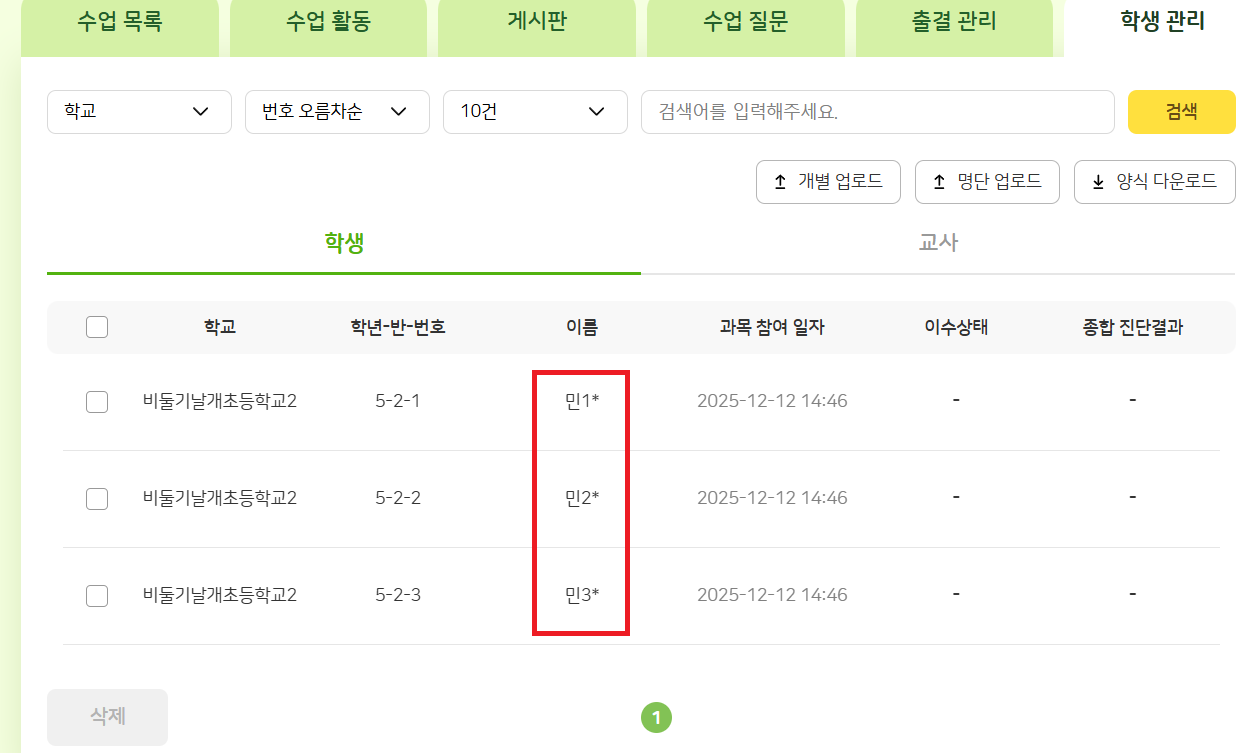 | Description | [암호화][FO][PC] 교사 : 지정 학급 > 학생관리 > 학생탭 > 업로드된 학생명 *기대결과 : 학생 이름 평문 노출 | ||||