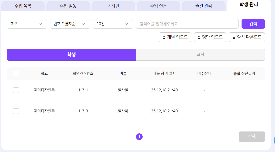 | Steps To Reproduce | 1. 교사 로그인 2. 나의 학교 > 나의 수업 > 지정 학급 > 학생관리 > 학생탭 > 업로드된 학생명 | ||||