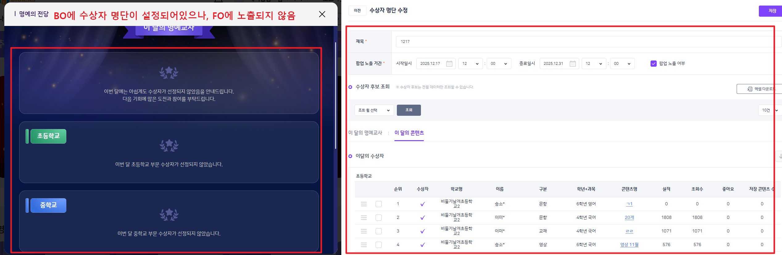 | Description | 명예의 전당 팝업에 이달의 명예교사 및 콘텐츠가 노출되지 않는 현상입니다. ※ 0001843 이슈 수정 배포 후 이슈 발생되고 있어, 해당 이슈와 연관이 있는 것으로 보입니다. | ||||