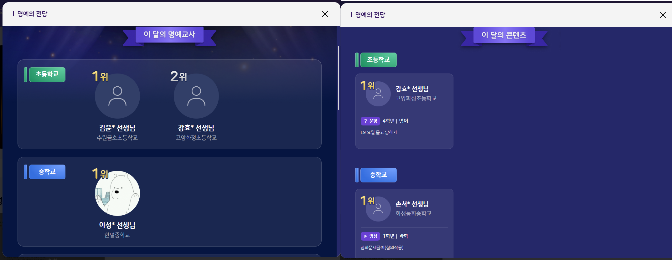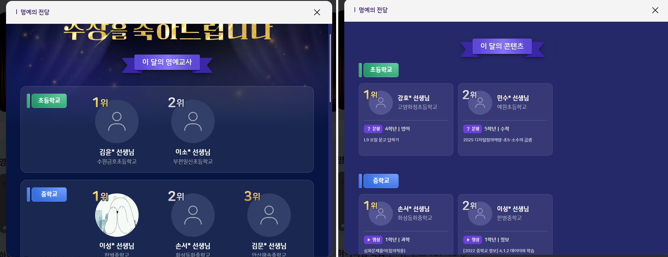| Steps To Reproduce | 1. 교사 로그인 2. 학습 콘텐츠 > 추천 콘텐츠 진입 3. 배너 목록에서 [수상자 명단 보기] 클릭 4. 명예교사 및 콘텐츠 데이터가 노출되지 않음을 확인 | ||||