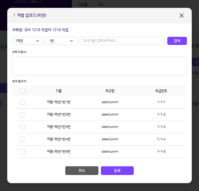 | Summary | 0001853: [검색][FO] 나의 수업 > 과목 상세 > 학생 관리 > 학생탭 > 개별 업로드 > 검색 | ||||